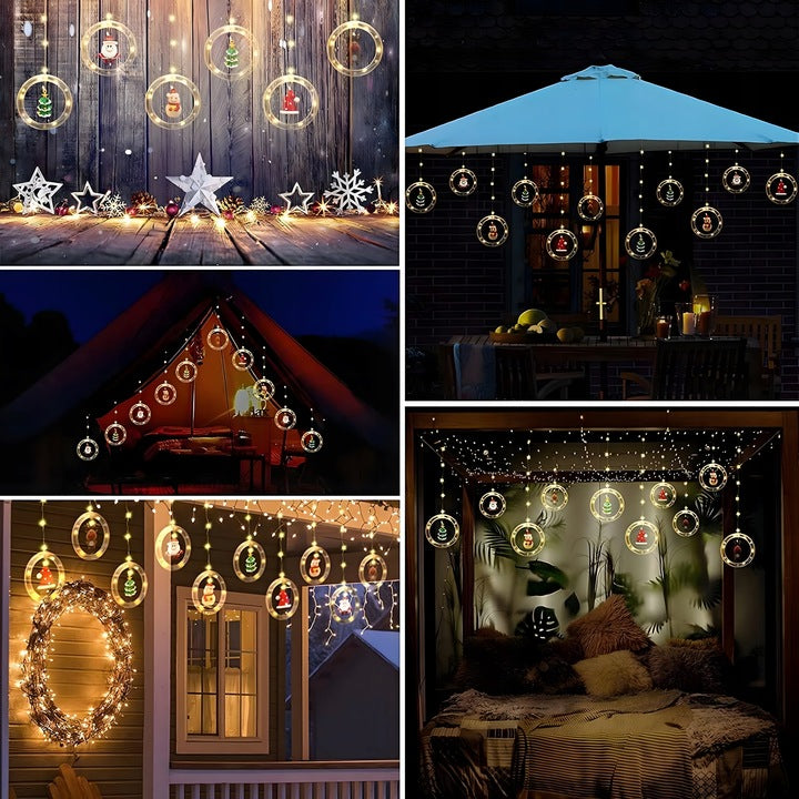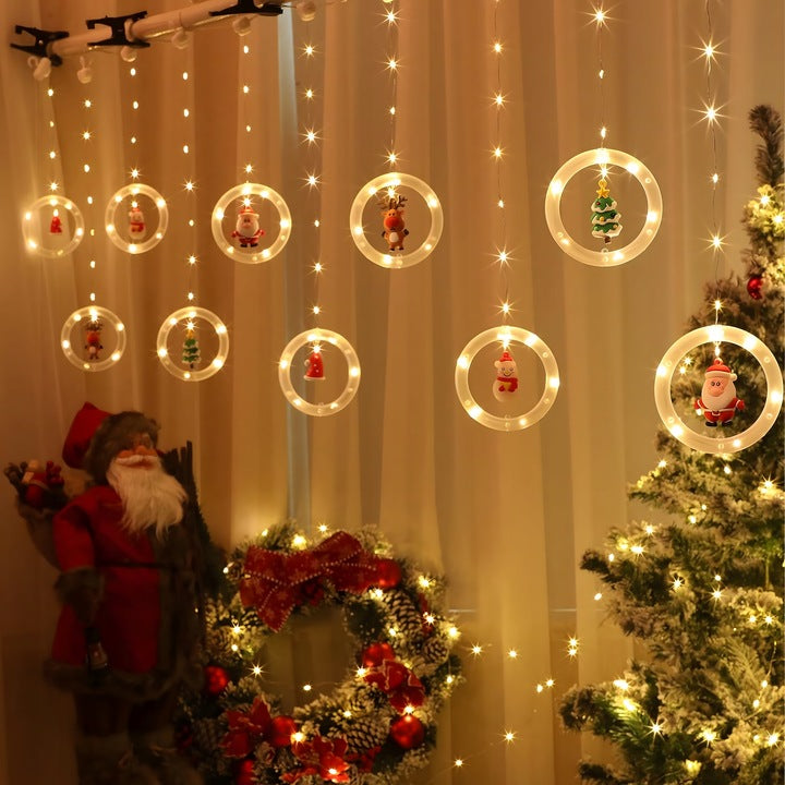 🎄 10 kółek z figurkami – każde o średnicy 10 cm, ozdobione diodami.