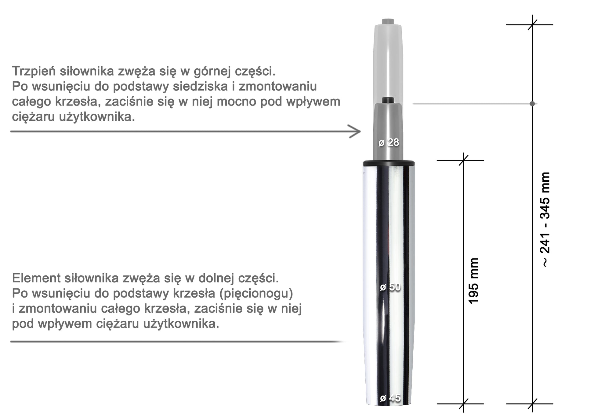 Ważne aby nowy siłownik miał zbliżoną wysokość do oryginalnego. Szczególnie w przypadku krzeseł z mniejszą podstawą (np. dziecięcych), montaż znacznie wyższego podnośnika może wpłynąć na stabilność i zwiększyć ryzyko przewrócenia – np. przy mocnym odchyleniu do tyłu.